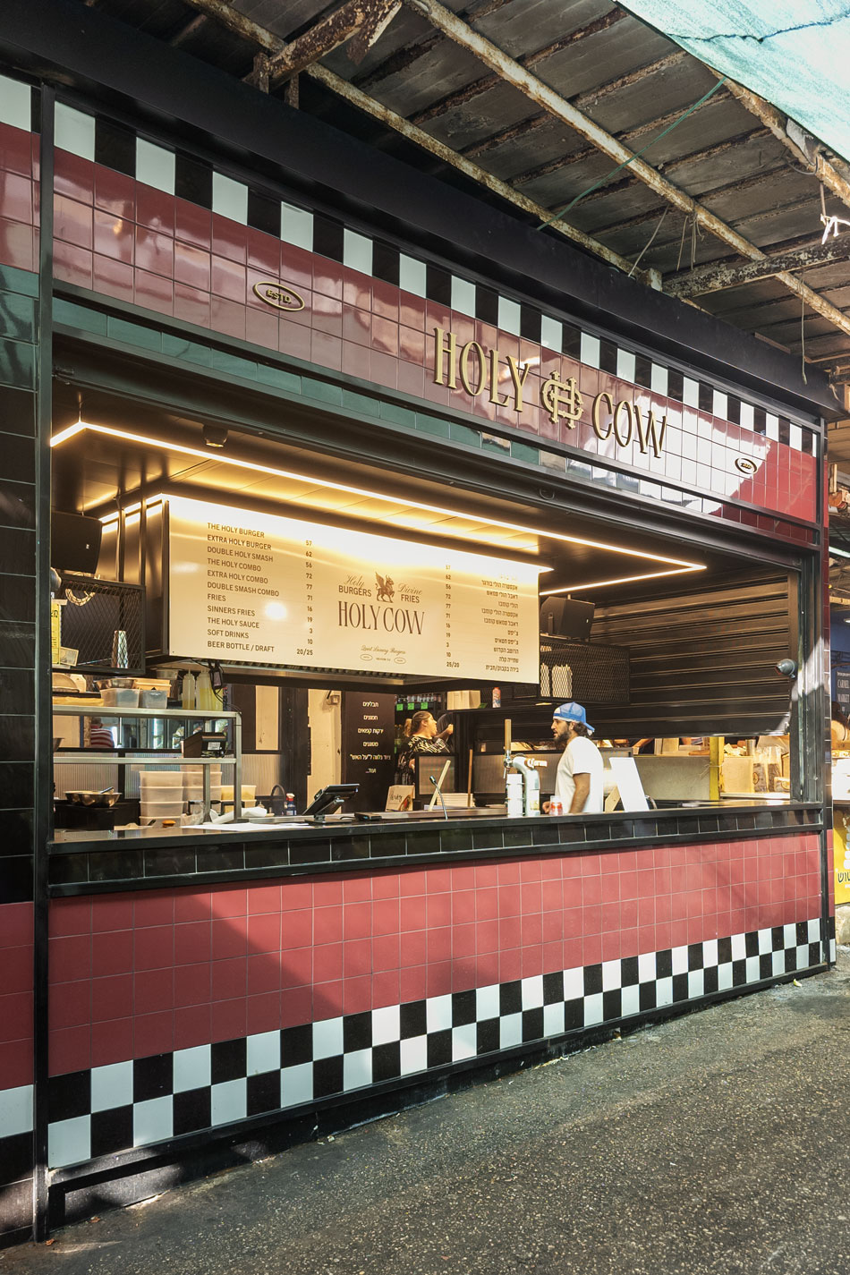 העיצוב שואב השראה מדוכני אוכל קלאסיים ושווקים אורבניים, עם חיפויי קרמיקה מבריקה בגוון אדום עמוק, דוגמת שחמט שחור-לבן, שילוב מתכת חשופה ותאורה חמה המדגישה את אזור ההכנה וההגשה.