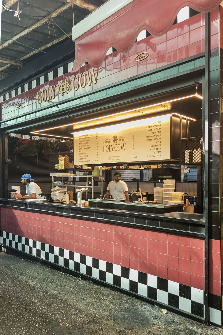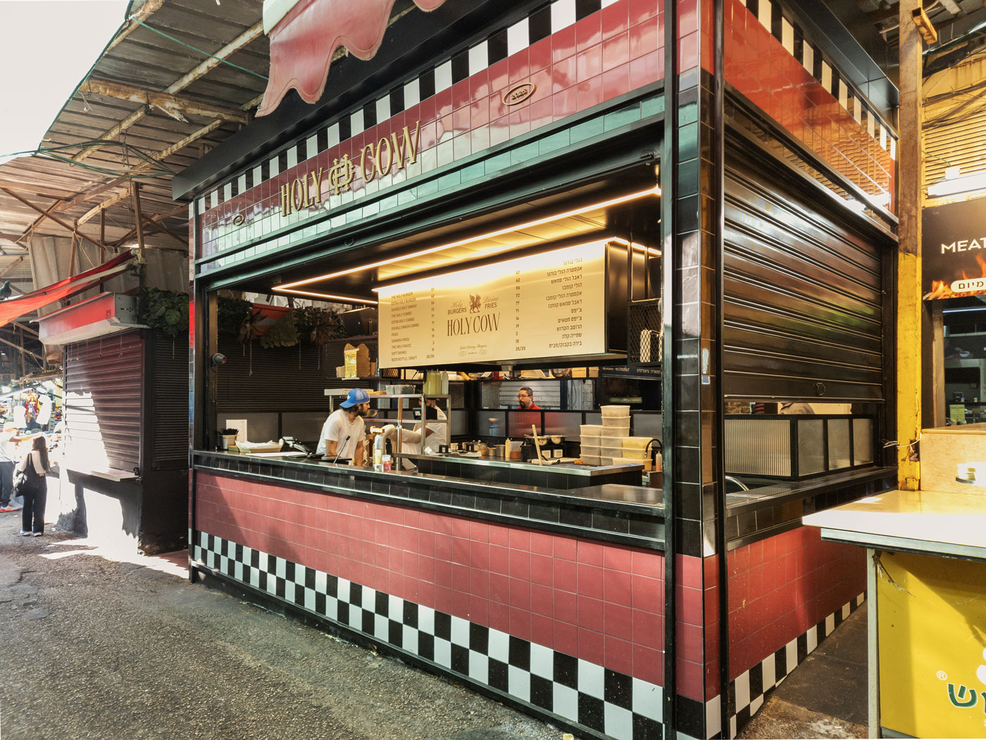 העיצוב שואב השראה מדוכני אוכל קלאסיים ושווקים אורבניים, עם חיפויי קרמיקה מבריקה בגוון אדום עמוק, דוגמת שחמט שחור-לבן, שילוב מתכת חשופה ותאורה חמה המדגישה את אזור ההכנה וההגשה.
